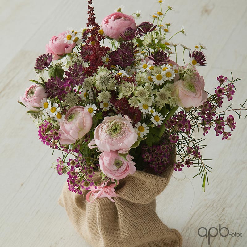 Ramo de flores silvestres según temporada a elección del florista presentadas en saco y entregadas con agua en el mismo.